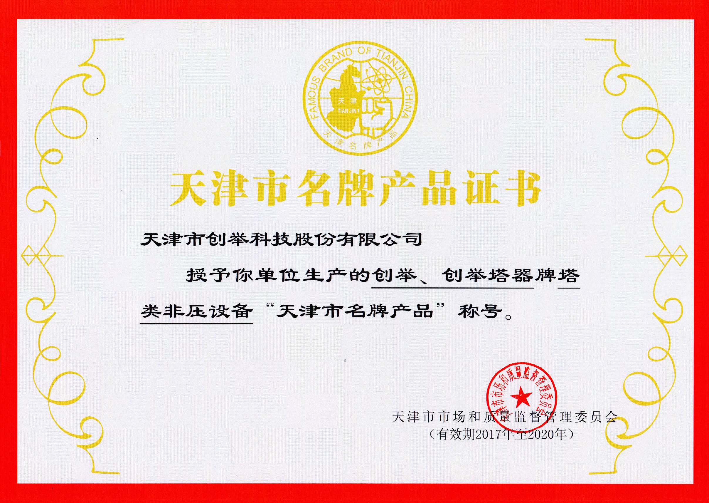 2014年     “創舉塔器”獲得天津市名牌產品稱號。