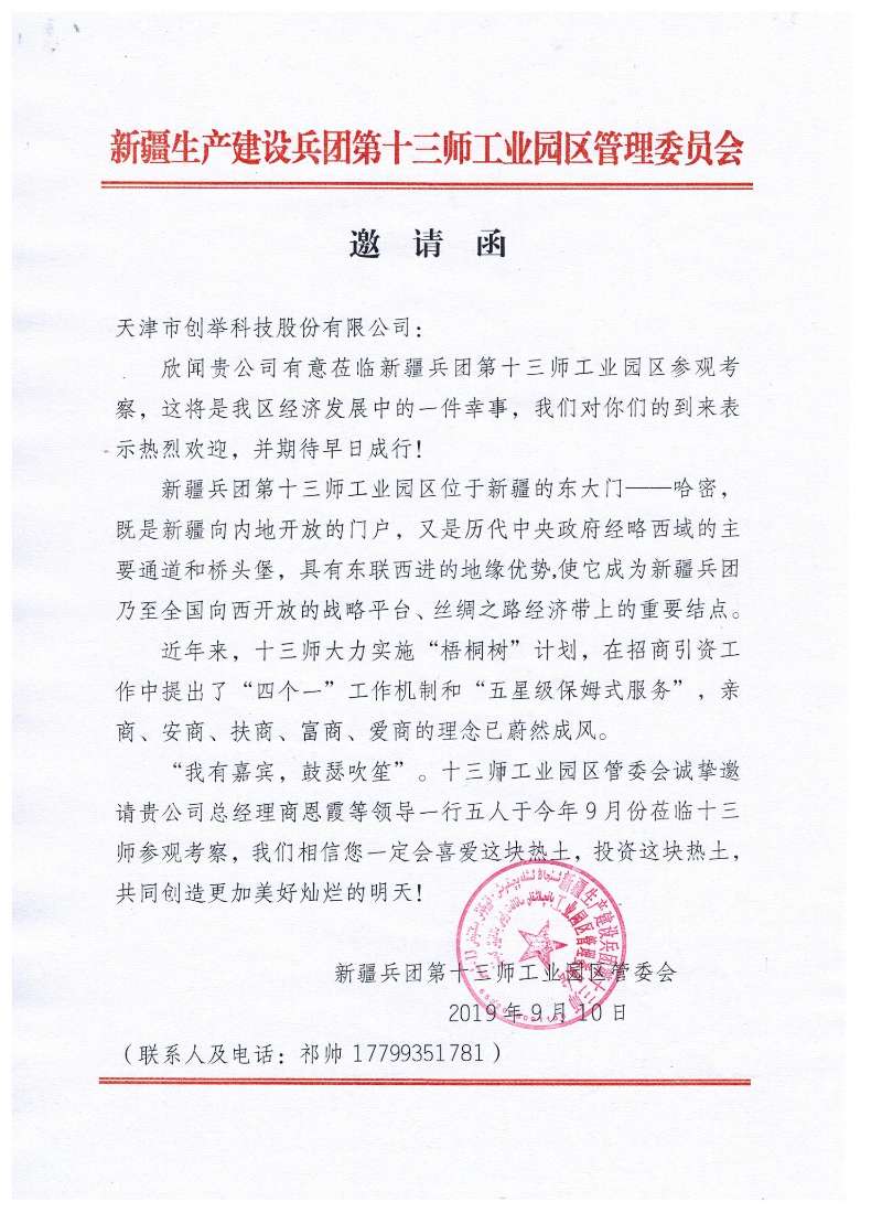 2019年月23日,天津市創舉科技股份有限公司(以下簡稱“創舉公司”)受邀赴新疆生產建設兵團第十三師工業園區交流考察。