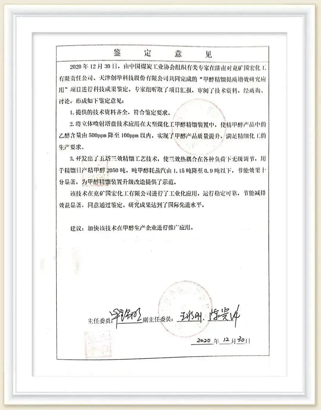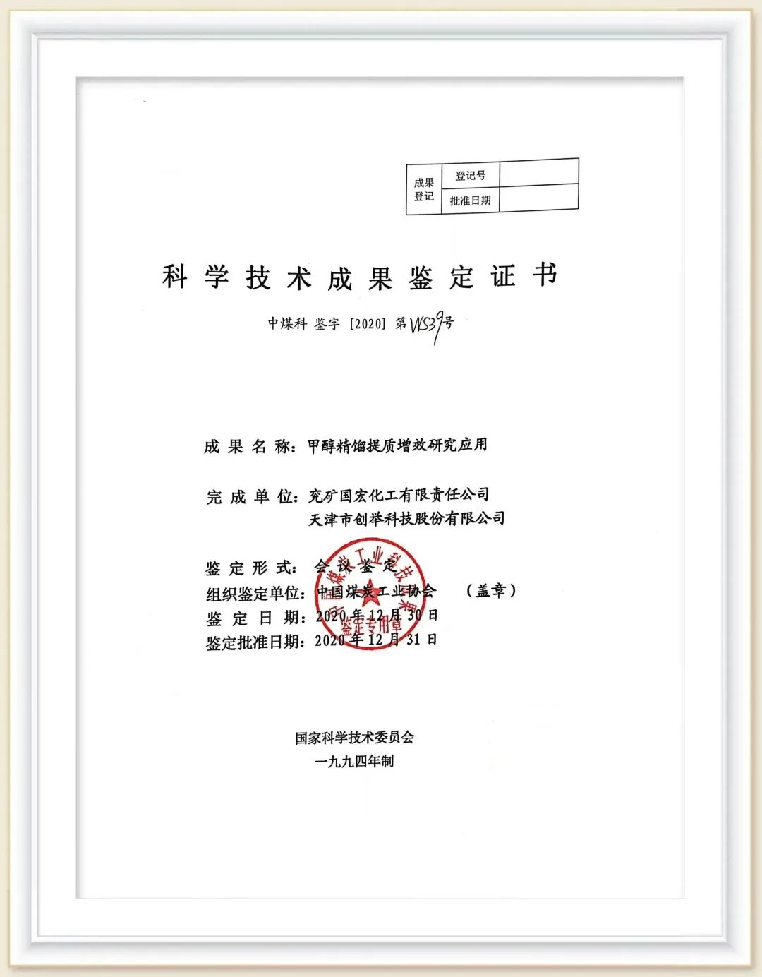 2020年,由兗礦國宏公司及創舉科技共同申報的“甲醇精餾提質增效研究應用”順利通過中國煤炭工業協會科學技術成果鑒定,并鑒定該項技術成果達到“國際先進”水平。