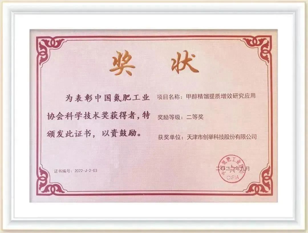 2022年,創舉科技申報的“甲醇精餾提質增效研究應用”項目,榮獲中國氮肥工業協會科學技術獎二等獎。