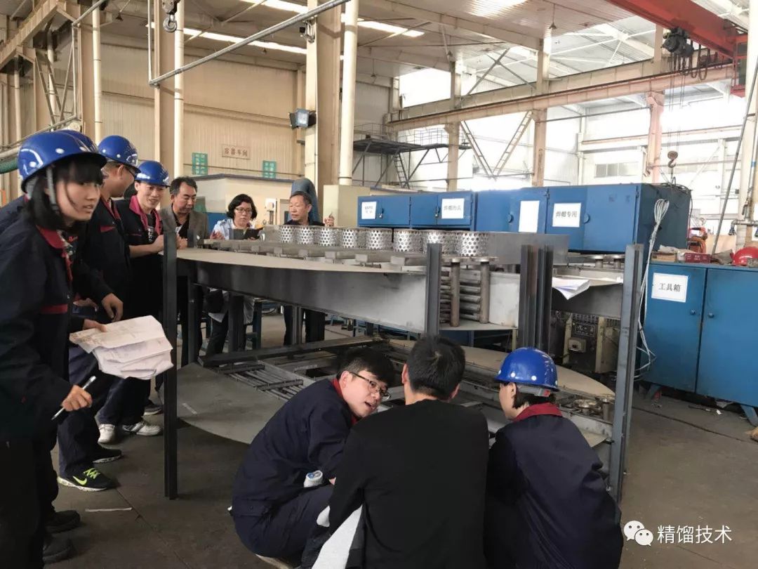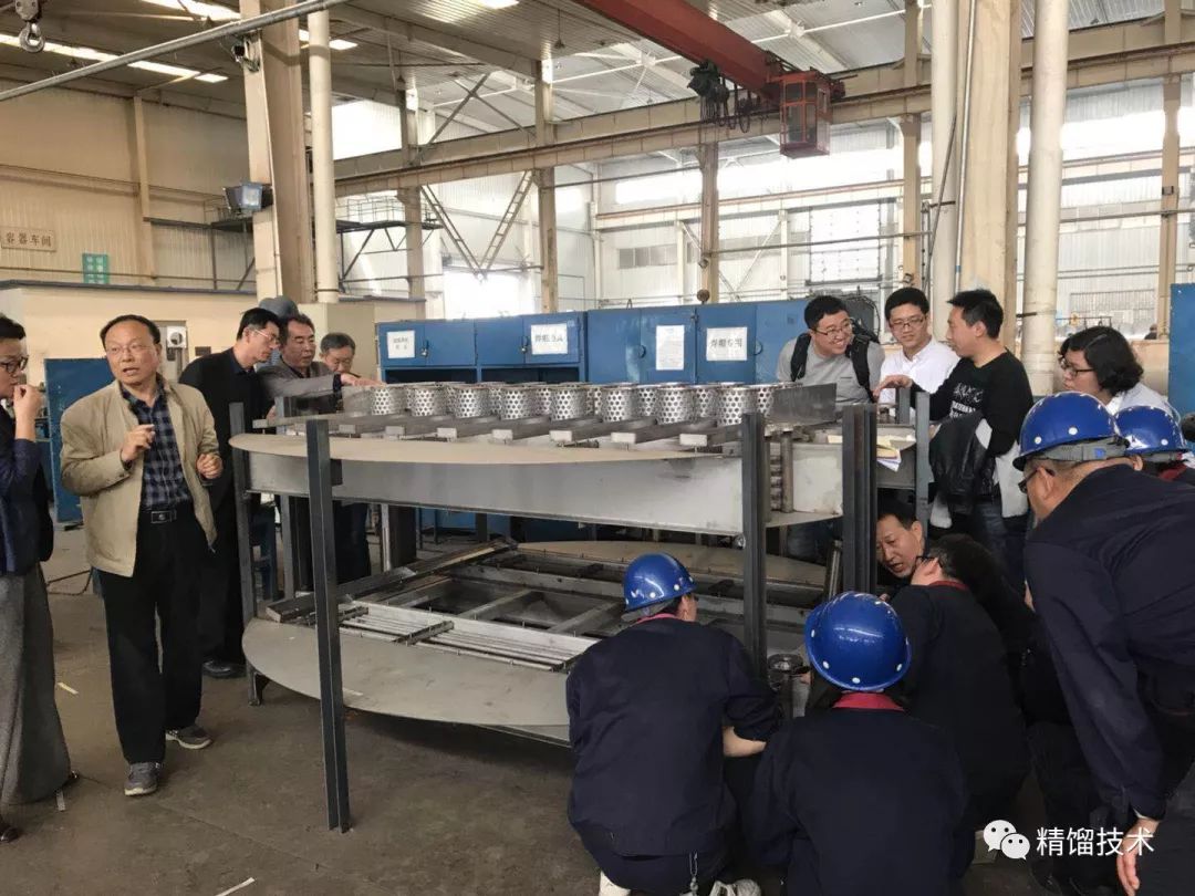 由于在實際生產中發現原塔盤壓降較高,故創舉公司本著對客戶負責的態度集思廣益,重新對原復合移熱塔盤進行改進,在實現高效傳質和傳熱同時進行的前提下,降低塔盤壓降。新塔盤設計完成后,為了提早發現在塔盤安裝過程中可能存在的問題,設備廠預制兩層等比例的新塔盤,邀請浙江瀚普一行領導來創舉設備廠進行考察,公司董事長王柱祥和常務副總商恩霞帶領工藝部、設備部、工程部相關技術人員同時陪同,及時發現新塔盤結構中的缺點并進行優化。充分體現了敬業、進取、創新的創舉精神。